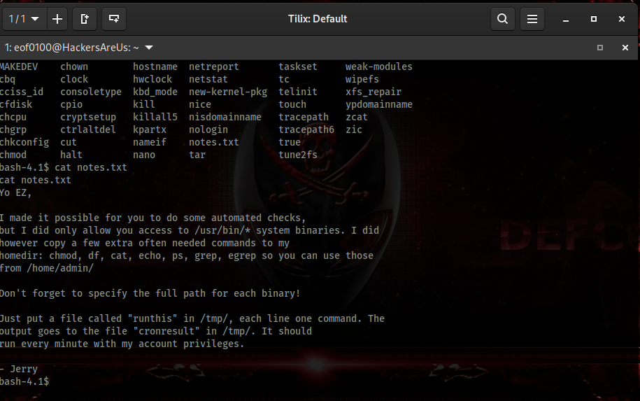 Basically, we’ve converted a log file into a way to execute commands on the server remotely, which is exactly what you want in a boot2root CTF when trying to escalate access and explore the system.