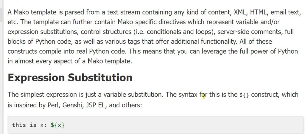 I tried entering Python code directly into the ?text= parameter, but it did not execute because the application does not run my input as standalone Python code. Instead, it places my input inside a Mako template, and Mako only evaluates code when it is written using its own template syntax, such as ${...}. I discovered that after going over the Mako Documentation. Here is a snippet of the Mako documentation syntax that I found.