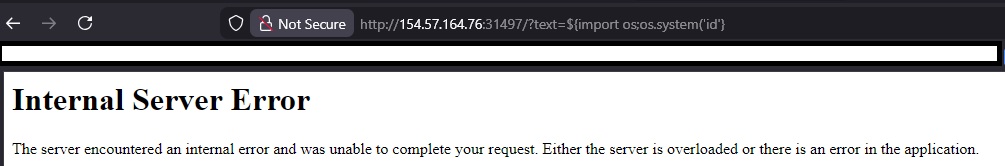 As you can see from the screenshot above the expression was successfully evaluated and provided an output on the page. Next, I wanted to see if I can execute a shell command and see who the webserver is running as (usually as www-data). I tried inputting python statement “?text=${import os; output = os.popen(“id”).read();print(output)}” which only gave me an Internal Server Error.